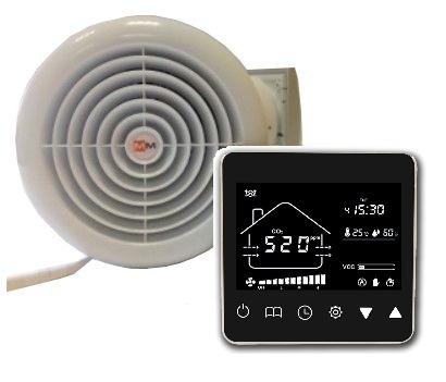 TkV-03 СО2 "Сибирь" приточная с подогревателем. Интеллектуальный контроллер воздуха СО2, 3 скорости, 30/70/100 м³/ч, 800 Вт (эл. Калорифер) + 18 Вт (вентилятор), 3-и режима работы (авторучнойтаймер), встроенный термостат (менее +16ºС- вкл., более +29ºС- выкл.), обратный клапан, фильтр (угольный + G4). Минимальная толщина стены 270 мм, Ø 150 мм . Внутренняя решётка — круглая белая