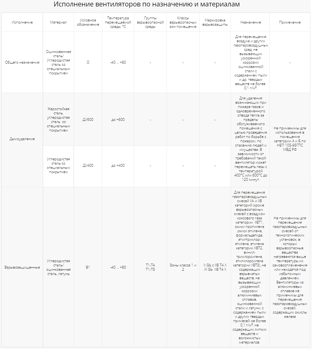 Вентиляторы выпускаются следующих исполнений согласно таблице «Исполнение вентиляторов по назначению и материалам»