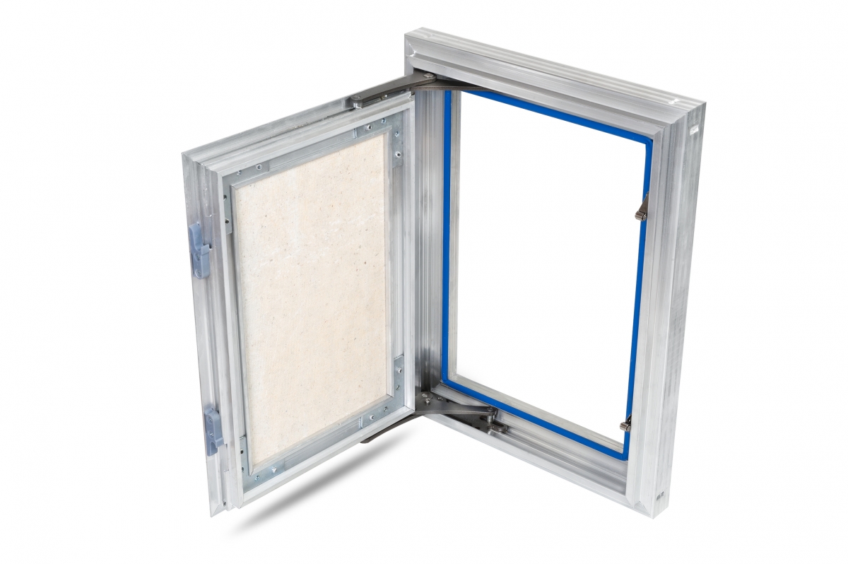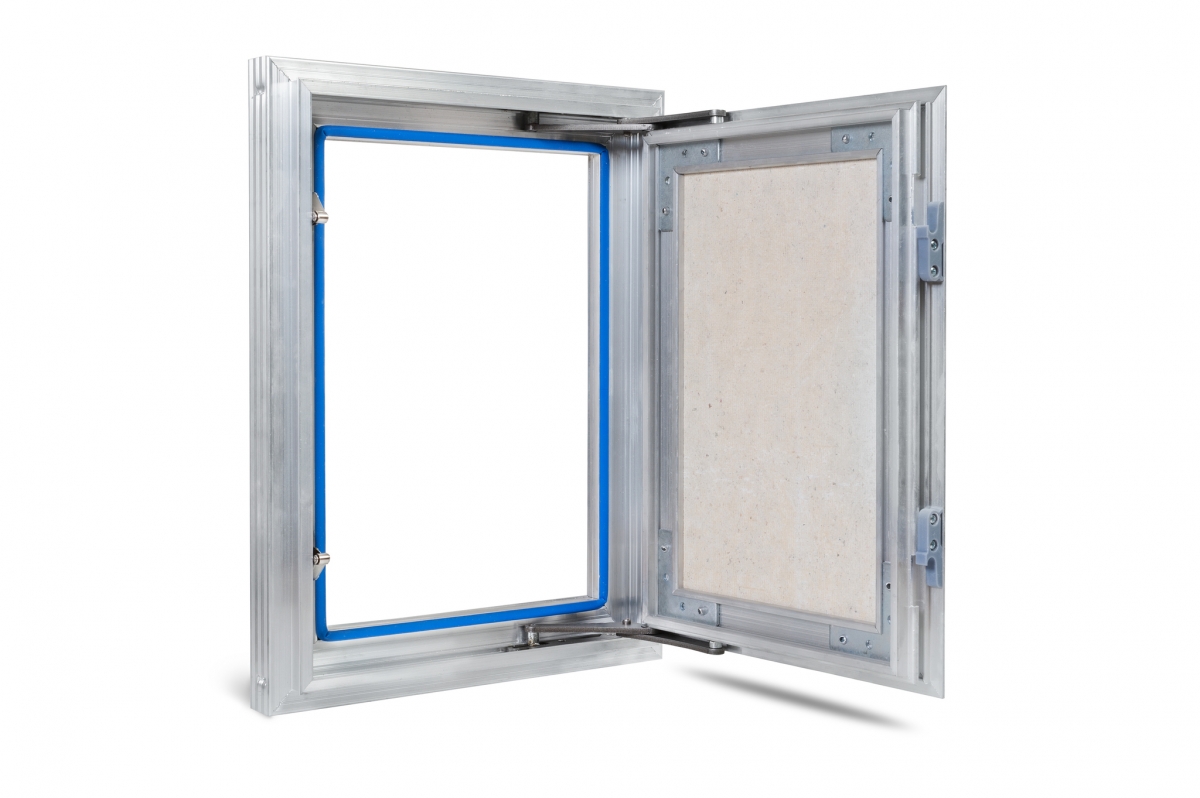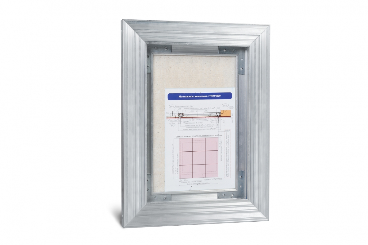 Рама люка для ревизии «Триумф» выполнена из алюминиевого профиля коробчатой формы и Г-образной в сечении для максимальной жесткости и удобства монтажа. Дверца люка изготавливается и алюминиевого профиля Т-образной формы, переменного сечения, с выраженными ребрами жесткости, что делает её конструкцию более жесткой в отличие от своих предшественников. Так как немаловажно исключить перекосы конструкции дверцы, чтобы не допустить деформации наклеенных на нее материалов. В отличие от наших конкурентов, толщина стенок алюминиевого профиля у нас по-прежнему 2 мм и более.