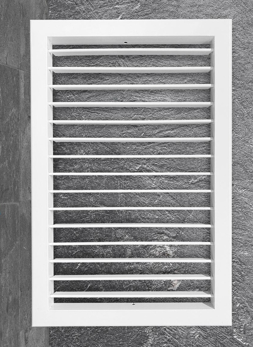 RAG - приточно-вытяжные алюминиевые решетки с индивидуально регулируемыми горизонтальными жалюзями, установленными на пластиковых втулках. Окраска порошковая, цвет белый (RAL 9016)